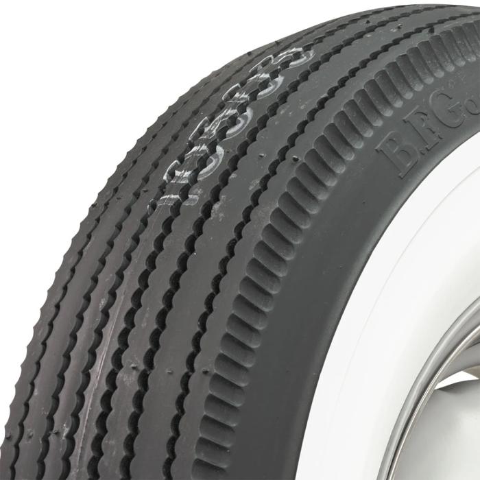 With genuine wide whitewall construction and period-correct sawtooth tread design, these BFGoodrich tires are the ultimate classic tire for collector vehicles. These tires feature a nice pie crust upper sidewall styling and beautiful wide whitewalls. When shopping for tires for vintage cars, look no further than these authentic BFGoodrich wide whites. BFGoodrich bias ply wide whitewall tires are made in the USA and DOT/ECE (European Community) approved where applicable. Wide whitewalls are smooth, with all stampings and lettering in the the black portion of the sidewall and are covered by our exclusive life of the tread warranty. Please note that dimensions listed tread width, section width and overall diameter are non-scientific and based on an inflated tire, mounted on a wheel. Dimensions may vary due to rim width and inflation pressure. Tread patterns and sidewall styles vary, please click on individual tires below to view photos.