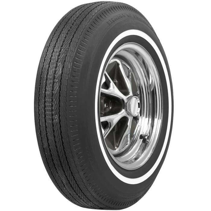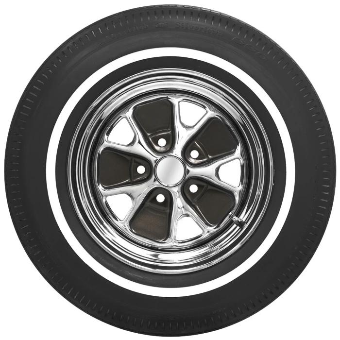 This product features a genuine narrow whitewall sidewall style. This means that the bright white rubber is added directly to the tire sidewall during initial construction of the carcass, resulting in a truly integrated, high-quality product after vulcanization. When we reference "narrow whitewall" tires, we typically mean a whitewall that measures less than two inches, but it can also mean a whitewall that does not reach all the way into the bead. Narrow whitewall tires are popular for many cars built in 1960's all the way into the 1990's.