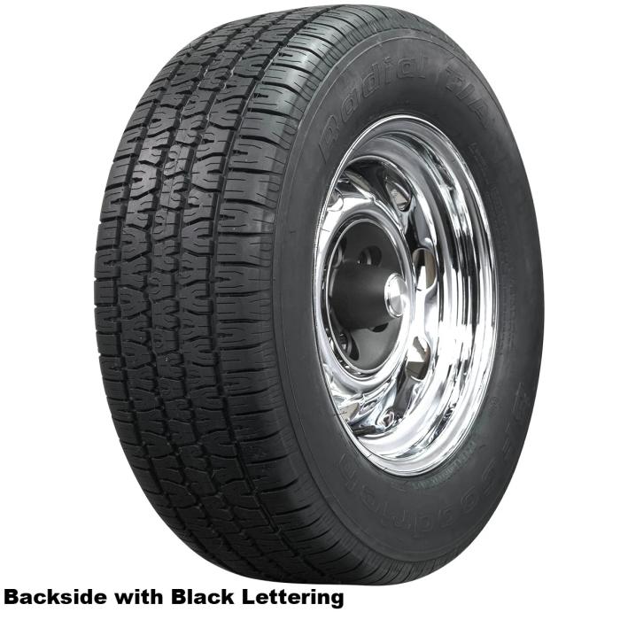 This is a raised white letter tire, sometimes called RWL for short. Raised white letter tires became common in the late sixties on muscle cars like the Pontiac GTO and high performance pony cars, like the Ford Mustang. Raised white letter tires feature white rubber that is built into the tire's sidewall when the carcass is being assembled. The letters are formed when the tire is vulcanized in a curing mold, and then buffed clean to reveal bright white letters. Popular raised white letter tires include Firestone Wide Oval and Wide Oval Radials, BFGoodrich Radial T/A, and Goodyear Polyglas tires.