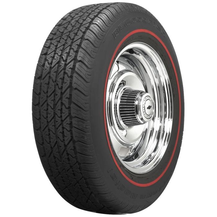 This product features a genuine redline sidewall style, sometimes known as a red stripe, due to the thin 3/8-inch strip rubber. This means that the red rubber is added directly to the tire sidewall during initial construction of the carcass, resulting in a truly integrated, high-quality product after vulcanization. Redline tires hit the American automobile market in 1964 with the introduction of the Pontiac GTO and remained a popular muscle car tire until around 1970. Dual redline tires (two red stripes) were an option on Ford Mustangs, and are now reproduced in original bias ply, bias look radial as well as radial construction. Choose the redline that best fits your application.